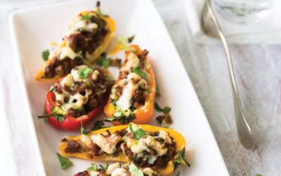 Place the pepper halves on the prepared baking sheet, cut side up. Spoon the filling into the peppers, pressing down gently and mounding it slightly. Sprinkle the cheese over the tops. Bake until the peppers are tender and the filling is nicely browned, 10 to 12 minutes. Serve sprinkled with more cilantro.